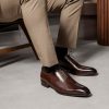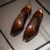 The One Cut Richelieu shoe, five eyelets, flowered toe, patinated chestnut leather. This model benefits from a harmonious and modern line. The leather of VASCO shoes comes from Italian tanneries renowned for the quality and suppleness of their leathers. Traditional Blake stitched assembly under engraving, patina done entirely by hand.